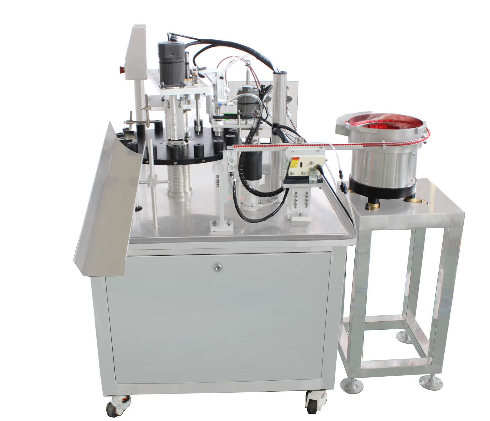 自動灌裝軋蓋機一體機可用于西林瓶、精油瓶、香水瓶全自動灌裝旋蓋及鎖蓋設備。整套流程分為:理瓶-灌裝-壓塞-掛蓋-軋蓋,其特點為生產穩(wěn)定,對包材通用性強。